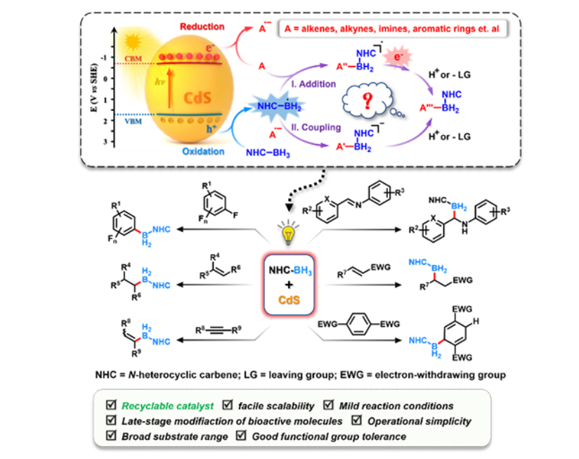 氮雜環卡賓硼烷(NHC-BH3)由于化學性質穩定且制備方法簡單,近年來作為新型硼源,被應用于自由基硼化反應中。然而,大量有害的自由基引發劑或昂貴且無法回收的均相光催化劑的使用,阻礙其廣泛應用。因此,發展通用、廉價且可循環的催化體系,對NHC-BH3參與的自由基硼化反應的發展具有重要意義。