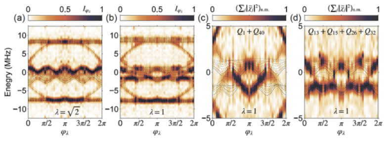 該工作設(shè)計(jì)了多達(dá)41個量子比特的對角Aubry-André-Harper(AAH)模型的各種實(shí)例,并應(yīng)用動態(tài)光譜技術(shù)實(shí)驗(yàn)測量了“侯世達(dá)蝴蝶”能譜(圖2)。由于對角AAH模型的拓?fù)涮匦裕霈F(xiàn)了“翅膀形狀”的能隙,整個能譜圖看起來猶如一只翩翩起舞的蝴蝶,讓人不禁聯(lián)想到戰(zhàn)國時(shí)期莊周夢蝶的故事,這是該量子處理器命名的緣由。由于“莊子”處理器擁有足夠多的量子比特,有限尺寸效應(yīng)的影響被抑制,“蝴蝶”身體細(xì)節(jié)中的分形結(jié)構(gòu)和能帶的分裂也被清晰地展示出來。