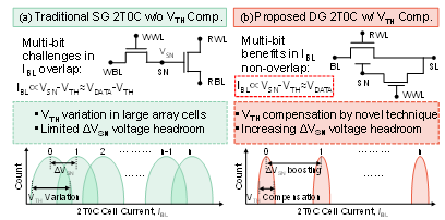 圖1:傳統(tǒng)單柵2T0C DRAM在多值存儲中面臨的挑戰(zhàn)以及雙柵2T0C DRAM在實現(xiàn)多值存儲中的優(yōu)勢
