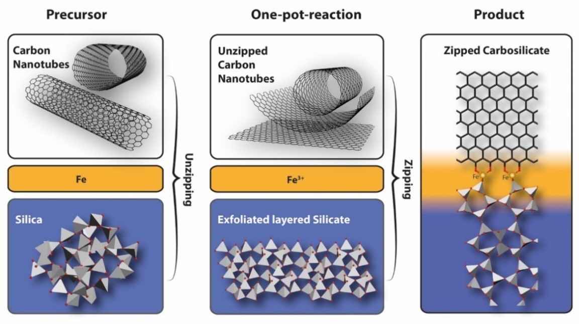 高性能納米碳材料和超薄二維硅酸鹽材料因其可設(shè)計(jì)性和廣泛的性能調(diào)節(jié)空間在高端材料領(lǐng)域引起了關(guān)注。將這兩類具有截然不同性能的納米材料進(jìn)行可控復(fù)合,無(wú)疑是拓展新材料以獲得新性能的有效途徑。碳材料存在化學(xué)惰性,因此之前的嘗試多是通過(guò)物理復(fù)合的方式將這兩種材料結(jié)合,以獲得具有二者性能的復(fù)合材料。雖然這種方法相對(duì)簡(jiǎn)單,但在微尺度上難以保證均一性和復(fù)合程度,從而限制了其在高端領(lǐng)域的應(yīng)用前景。如何通過(guò)穩(wěn)定的化學(xué)鍵合實(shí)現(xiàn)這兩種材料的化學(xué)復(fù)合,成為解決上述問(wèn)題的關(guān)鍵。近日,中國(guó)科學(xué)院青島生物能源與過(guò)程研究所等研究人員通過(guò)弱制氫反應(yīng)驅(qū)動(dòng)創(chuàng)造性地制備了一類新的碳和硅酸鹽二維超薄復(fù)合材料,并命名為carbosilicate(碳硅酸鹽),相應(yīng)材料在電解水制氫過(guò)程中展示出優(yōu)于商業(yè)IrOx的效果。通過(guò)協(xié)同作用,三種自身不能持續(xù)發(fā)生的反應(yīng)(鐵與水反應(yīng)制氫,碳管形成石墨烯帶,塊體氧化硅分解重排形成二維硅酸鹽層)在溫和的水熱條件下持續(xù)發(fā)生并化學(xué)鍵合,最終形成新的復(fù)合材料。