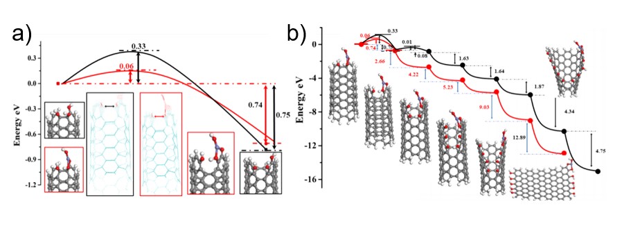 為了進(jìn)一步探究反應(yīng)機(jī)理,研究人員以AIMD模擬為主要手段,結(jié)合相應(yīng)靜態(tài)計(jì)算,研究了碳納米管在含鐵離子溶液中的“裂解”機(jī)理。結(jié)果表明鐵離子的存在對(duì)碳納米管的裂解具有重要促進(jìn)作用,特別是在初步碳-碳鍵裂解過(guò)程中,有鐵離子參與的第一個(gè)碳-碳鍵裂解能量(0.06 eV)比沒(méi)有鐵離子參與的裂解能量(3.3 eV)低了5倍。同時(shí)計(jì)算結(jié)果還表明溶液中氧(或氫氧根)的參與對(duì)碳納米管的持續(xù)裂解起到關(guān)鍵作用。這些計(jì)算結(jié)果與實(shí)驗(yàn)結(jié)果相吻合,為實(shí)驗(yàn)提供了有力驗(yàn)證。