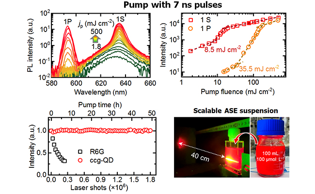 研究發(fā)現(xiàn),該量子點(diǎn)增益體系表現(xiàn)出超強(qiáng)的光穩(wěn)定性以及可放大合成的特性,尤其重要的是,可以在7納秒的固體激光泵浦下實(shí)現(xiàn)準(zhǔn)連續(xù)的放大自發(fā)輻射。由于放大自發(fā)輻射是激光輸出的“前驅(qū)體”,該工作有望為未來在諧振腔內(nèi)實(shí)現(xiàn)基于量子點(diǎn)液體的激光輸出奠定基礎(chǔ)。