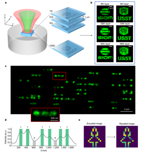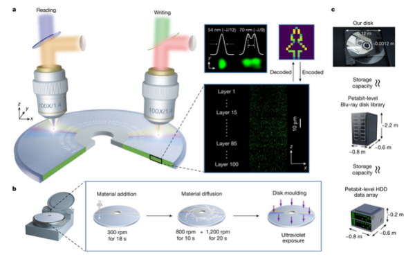 中國(guó)科學(xué)院上海光學(xué)精密機(jī)械研究所與上海理工大學(xué)等合作,在超大容量超分辨三維光存儲(chǔ)研究中取得突破性進(jìn)展。該團(tuán)隊(duì)利用國(guó)際首創(chuàng)的雙光束調(diào)控聚集誘導(dǎo)發(fā)光超分辨光存儲(chǔ)技術(shù),實(shí)驗(yàn)上首次在信息寫(xiě)入和讀出均突破了衍射極限的限制,實(shí)現(xiàn)了點(diǎn)尺寸為54nm、道間距為70nm的超分辨數(shù)據(jù)存儲(chǔ),并完成了100層的多層記錄,單盤(pán)等效容量達(dá)Pb量級(jí),對(duì)于我國(guó)在信息存儲(chǔ)領(lǐng)域突破關(guān)鍵核心技術(shù)、實(shí)現(xiàn)數(shù)字經(jīng)濟(jì)的可持續(xù)發(fā)展具有重要意義。2月22日,相關(guān)研究成果發(fā)表在《自然》(Nature)上。