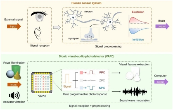 近日,中國(guó)科學(xué)院重慶綠色智能技術(shù)研究院微納制造與系統(tǒng)集成研究中心,在《科學(xué)進(jìn)展》(Science Advances)上發(fā)表了題為《可片上探測(cè)和預(yù)處理的仿生視聽(tīng)光電探測(cè)器》(Bionic visual-audio photodetectors with in-sensor perception and preprocessing)的研究論文。該研究提出了仿生“視聽(tīng)”光電探測(cè)器,通過(guò)模擬人類(lèi)感知系統(tǒng)中神經(jīng)突觸間的“興奮”和“抑制”行為,在傳感端集成了“視聽(tīng)”信號(hào)探測(cè)與預(yù)處理功能。