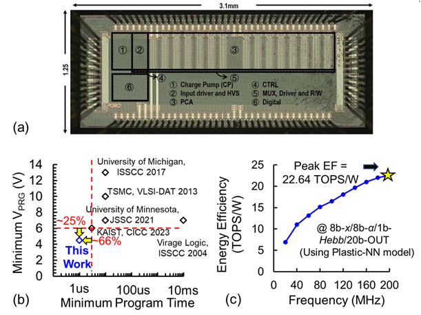 14nm FinFET非易失-易失融合型片上學(xué)習(xí)存算一體芯片:(a)顯微鏡照片,(b)非易失邏輯閃存單元編程電壓與時間對比,(c)工作頻率與計算能效
