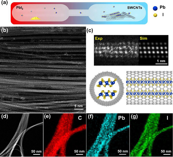 一維范德華異質結構為新型納米器件的設計和制備提供了新的思路和可能性,深入了解一維范德華異質結構的電子轉移機制和應用頗具挑戰(zhàn)性。針對以上科學問題,中國科學院蘇州納米技術與納米仿生研究所研究員康黎星團隊驗證了由單壁碳納米管封裝碘化鉛高質量一維異質結構的穩(wěn)定形成,并闡明了其層間電子轉移行為機制。此外,利用上述機制,研究人員設計了具有出色光電流和開關比的自供電光電探測器。 ?????