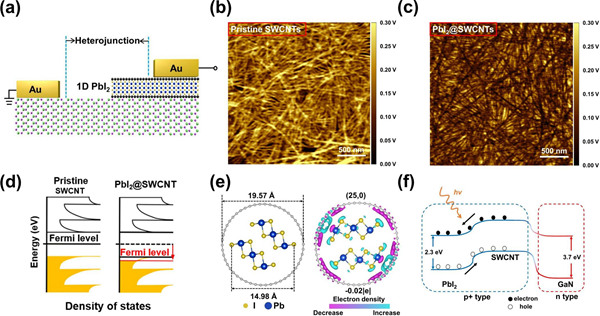 單壁碳納米管封裝碘化鉛異質結構對于自供電光電探測器的構建至關重要,這歸因于碘化鉛的強空穴摻雜。紫外光為分離電子-空穴對提供了額外的驅動力,增強了主體和客體材料之間的電荷轉移,并在與氮化鎵相互作用時產生強大的內建電場。??????