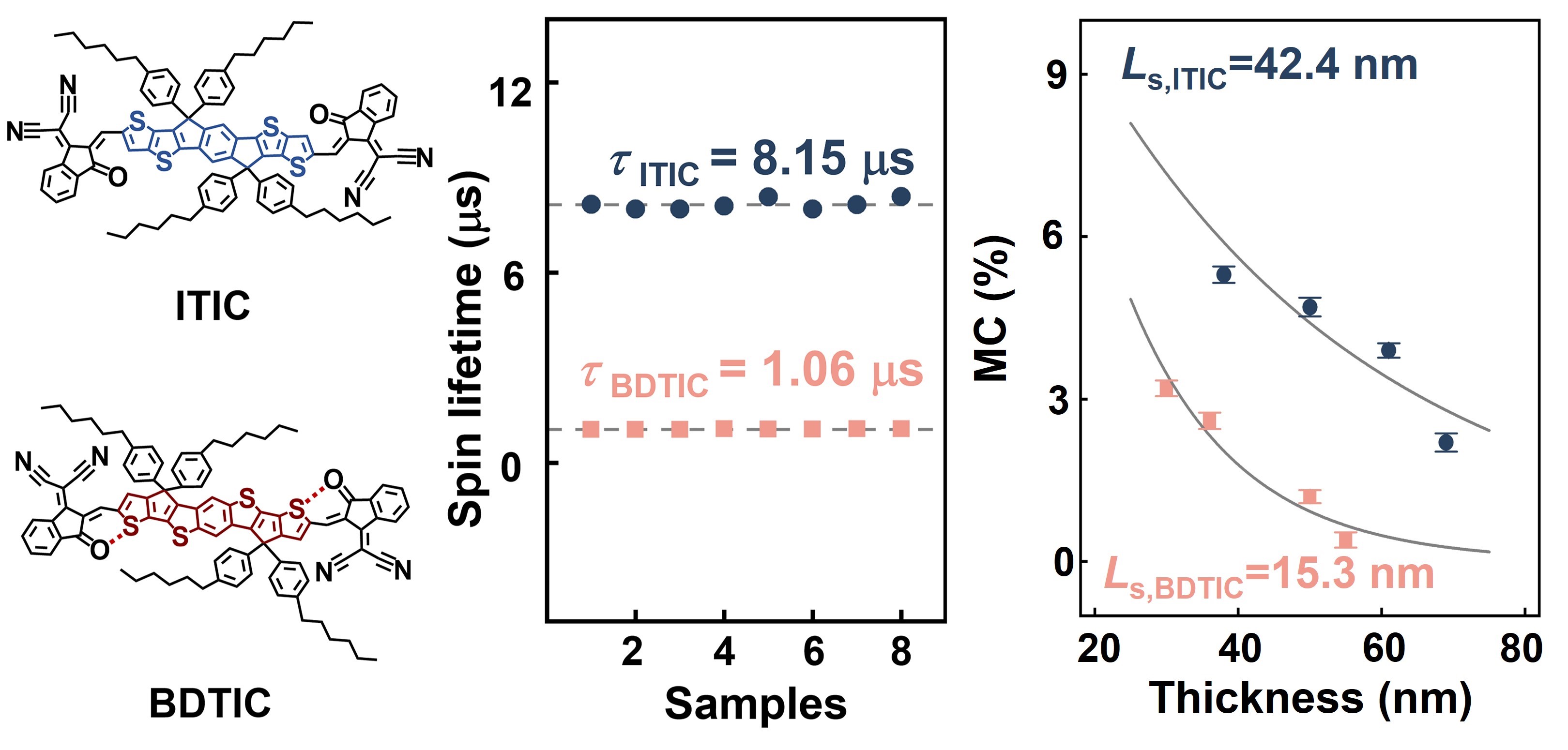分子半導體通常由原子序數較低的輕元素組成,因此具有較弱的自旋軌道耦合強度和較長的自旋壽命。元素組成主導的自旋軌道耦合效應通常被認為是導致自旋在分子半導體中弛豫的主要因素,進而影響材料自旋壽命和自旋擴散長度。同分異構是有機半導體材料的典型現象,由于同分異構體的元素組成完全相同,通常認為同分異構體之間的自旋壽命和輸運性能理應差異不大。ITIC和BDTIC是分子電子學研究中商業化的互為結構異構體的小分子半導體材料,具有確定的化學結構和較高純度。基于對ITIC和BDTIC同分異構體的自旋輸運性能的研究,該團隊通過實驗證明,盡管ITIC及其結構異構體BDTIC這兩種薄膜的電荷輸運和分子堆積性質非常相似,但其自旋輸運性能完全不同。通過進一步的電子順磁共振實驗和密度泛函理論計算,研究發現在BDTIC中形成的非共價構象鎖可以增加自旋輸運路徑上的自旋軌道耦合作用,從而降低自旋壽命。