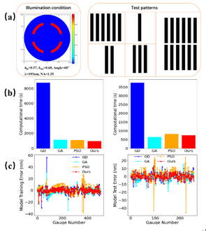 圖(a)光刻曝光條件和測(cè)試圖形;(b)在兩次實(shí)驗(yàn)中各方法的耗時(shí);(c)在訓(xùn)練集和測(cè)試集的誤差分布