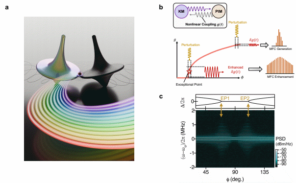 a、磁子模式(示意圖中類比為陀螺)間的特殊耦合狀態(tài),能夠提高磁子頻率梳(示意圖中表示為光帶)的產(chǎn)生效率;b、利用奇異點(diǎn)增強(qiáng)磁子頻率梳原理圖;c、位相調(diào)控下磁子頻率梳的增強(qiáng)