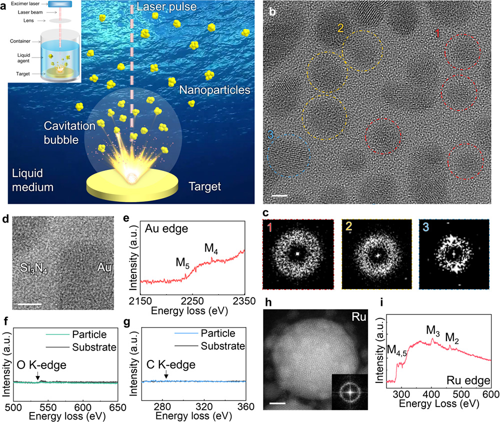 該研究采用超快皮秒脈沖激光技術,在無水乙醇液體介質中對各種單質高純金屬靶材進行液相燒蝕。研究通過調控制備參數(shù),以無水乙醇作為液體保護冷卻介質,避免非均勻形核,實現(xiàn)了接近1013?K s-1的快速冷卻速率,可抑制單質金屬晶體的形核和生長過程。由于激光燒蝕這種原子制造方法能夠產(chǎn)生大量具有不同能量和構型的顆粒,有可能捕獲單質金屬能量地貌圖中各種不同穩(wěn)定性的非晶構型,從而篩選到具有室溫穩(wěn)定性的單質非晶納米顆粒。 這一技術將各種金屬單質納米顆粒轉變成單質非晶態(tài)顆粒。