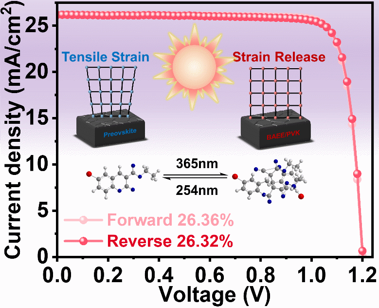 近日,該課題組提出了用于提高鈣鈦礦太陽能電池效率和光穩(wěn)定性的分子誘導應變調節(jié)和界面鈍化策略。研究利用6-溴香豆素-3-羧酸乙酯(BAEE)的環(huán)加成反應消耗紫外光,從而抑制薄膜的殘余拉伸應力。同時,BAEE可以與氧化鎳形成鍵合促進鈣鈦礦的生長和界面缺陷的鈍化,獲得26.08%的認證效率、1.201V的開路電壓。這降低了開路電壓損失,提升了器件的長期穩(wěn)定性,為提高鈣鈦礦光電轉換器件的效率與穩(wěn)定性提供了新策略。