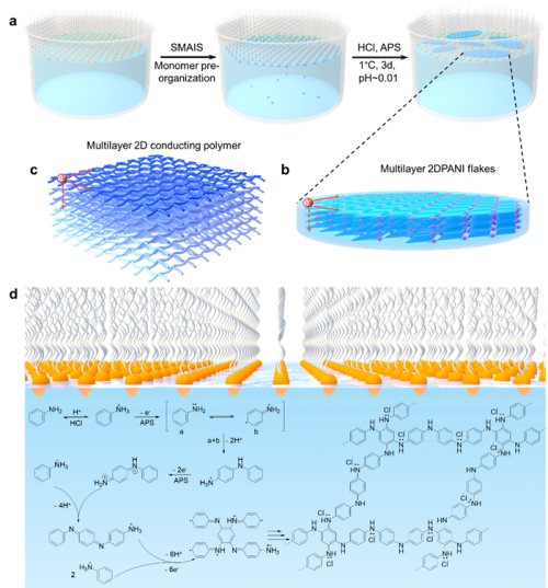 中國科學院寧波材料技術與工程研究所、德累斯頓工業(yè)大學、德國馬普高分子研究所、西班牙巴斯克納米科學合作研究中心等的科研人員,制備出多層堆疊的二維聚苯胺(2DPANI)晶體。這一晶體展現(xiàn)出高導電性與面外金屬性電荷傳輸特性,為導電聚合物材料研究開辟了新途徑。傳統(tǒng)線性導電聚合物主要通過沿聚合物鏈移動的載流子實現(xiàn)彈道傳輸,而擴展維度的導電性因缺乏分子間有序性和電子耦合而較弱。這種新型2DPANI晶體打破了這一局限。