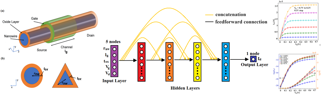 在GAAFET器件仿真加速方面,EDA中心姚振杰副研究員團(tuán)隊(duì)和北京航空航天大學(xué)、概倫電子合作,提出一種密集連接深度神經(jīng)網(wǎng)絡(luò)(DenseDNN),通過(guò)在神經(jīng)網(wǎng)絡(luò)各層之間建立直接連接,提供更強(qiáng)的特征提取和信息傳遞能力。結(jié)合代價(jià)敏感學(xué)習(xí)方法,模型更加關(guān)注決定器件特性的關(guān)鍵數(shù)據(jù),從而實(shí)現(xiàn)對(duì)關(guān)鍵器件特性的準(zhǔn)確預(yù)測(cè)。該研究工作展現(xiàn)了人工智能在器件建模方面的性能和效率優(yōu)勢(shì),為先進(jìn)半導(dǎo)體器件的智能化模型提供了參考。