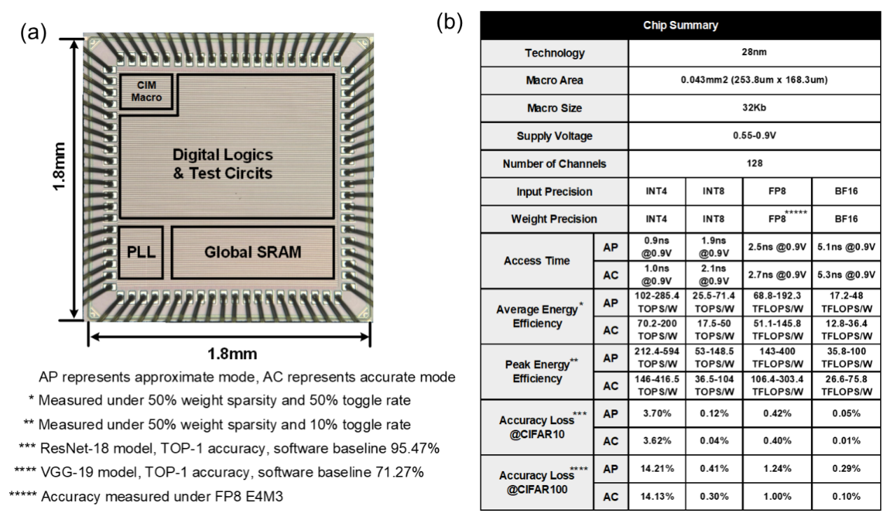 圖1. 28nm 基于外積的數(shù)模混合浮點(diǎn)存算一體宏芯片:(a)芯片顯微鏡照片,(b)芯片特性總結(jié)表。