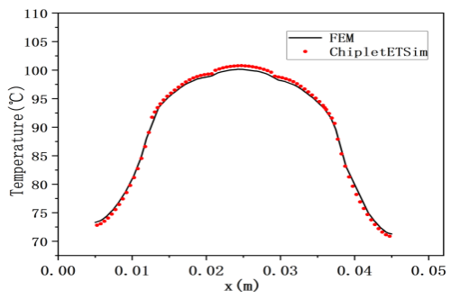 近期,課題組在Chiplet熱仿真工具方面取得新進展。通過對重布線層(RDL)、硅通孔(TSV)和凸點陣列進行各向異性等效,構建了從GDS版圖到系統級封裝的跨尺度各向異性熱仿真模型,在提升仿真模型精度的同時優化了集成芯片溫度熱點檢測方法。同時,構建了芯粒異構集成電熱耦合仿真模型,支持復雜互連結構物性參數等效,實現了電熱雙向耦合高效計算,可準確描述集成芯片焦耳熱效應下的溫度變化行為。此外,基于以上模型和算法研究進展,將熱仿真方法拓展至更大尺度,自主研發了晶圓級熱仿真模擬器。該模擬器能夠為芯粒異構集成芯片提供更大尺度的熱仿真分析,同時支持散熱器流體動力學模型設計,仿真結果更接近實際應用場景的潛在溫度熱點預測,有助于優化熱設計仿真流程。與有限元方法相比,模擬器單元數量減少了2.78倍,運行時間減少了25.9倍,相對誤差為0.38%。目前,課題組與國內知名企業開展了熱仿真關鍵技術合作,相關模型和算法正在進行應用驗證。