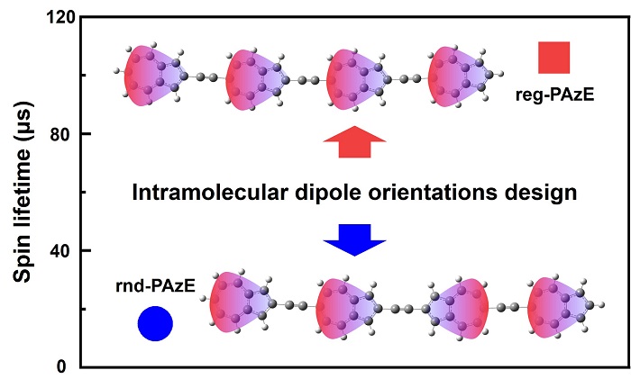 近日,中國科學(xué)院國家納米科學(xué)中心研究員孫向南團隊通過理論研究發(fā)現(xiàn),分子半導(dǎo)體材料的分子內(nèi)偶極取向能夠影響超精細相互作用,而超精細相互作用強度是決定材料自旋壽命的關(guān)鍵因素。基于這一發(fā)現(xiàn),該團隊聯(lián)合上海有機化學(xué)研究所研究員高希珂團隊,基于具有相同元素組成與共軛結(jié)構(gòu)平面性但分子內(nèi)偶極排列不同的2,6-薁基共軛聚合物,結(jié)合電子順磁共振技術(shù)和自旋閥器件,實驗證明了通過設(shè)計分子內(nèi)偶極取向可以顯著抑制超精細相互作用,從而獲得了高達106μs的室溫自旋壽命,創(chuàng)造了室溫紀(jì)錄值。