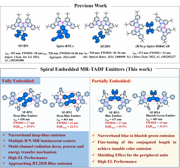 近期,中國科學(xué)院寧波材料技術(shù)與工程研究所研究員葛子義、副研究員李偉,聯(lián)合華南理工大學(xué)教授蘇仕健提出一種分子設(shè)計(jì)策略,將剛性 9,9'-螺雙[芴](SF)單元全部或部分整合到B/N-分子內(nèi)電荷轉(zhuǎn)移(MR)發(fā)光核心中,成功開發(fā)了含螺芴的MR-TADF材料體系SF-BN1、SF-BN2、SF-BN3 和 SF-BN4。該材料體系具有高色純度和高效率的特性。