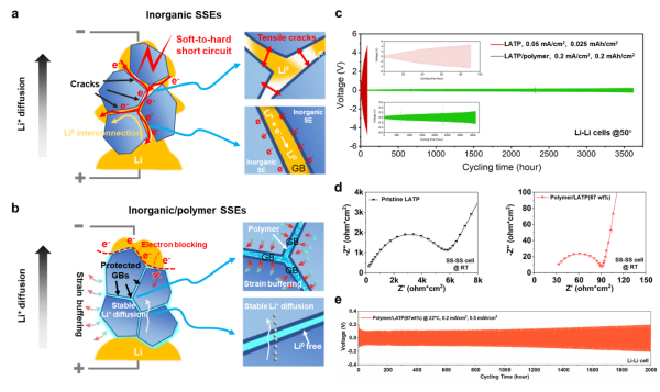 基于上述發(fā)現(xiàn),研究團(tuán)隊(duì)利用三維電子絕緣且機(jī)械彈性的聚合物網(wǎng)絡(luò),發(fā)展了無(wú)機(jī)/有機(jī)復(fù)合固態(tài)電解質(zhì),有效抑制了固態(tài)電解質(zhì)內(nèi)部的鋰金屬析出、互連及其誘發(fā)的短路失效,顯著提升了其電化學(xué)穩(wěn)定性。