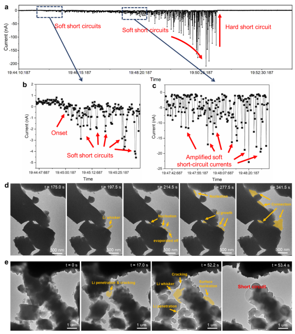 軟短路—硬短路的轉(zhuǎn)變動(dòng)力學(xué)的原位電鏡觀察和短路電流監(jiān)測(cè)