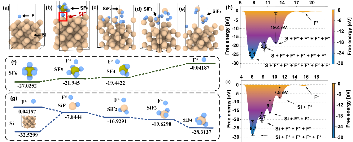 圖3:(左)基于DFT方法的刻蝕中間產(chǎn)物及反應(yīng)表面原子位能信息;