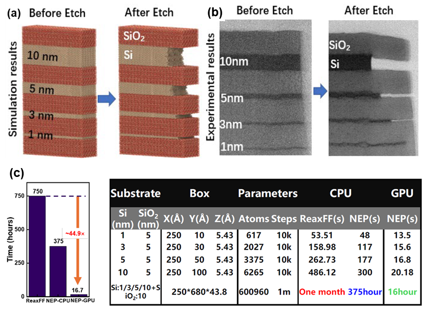 采用該勢函數(shù)模擬Si/SiO2變厚度多疊層結(jié)構(gòu)的橫向選擇性刻蝕工藝,成功實(shí)現(xiàn)了60萬原子級大體系的分子動(dòng)力學(xué)刻蝕輪廓推演。同時(shí),本研究在微電子所8吋先導(dǎo)工藝平臺(tái)上完成了相應(yīng)結(jié)構(gòu)的流片實(shí)驗(yàn),并結(jié)合透射電子顯微鏡(TEM)表征,驗(yàn)證了仿真結(jié)果的正確性。通過與傳統(tǒng)的反應(yīng)力場分子動(dòng)力學(xué)(ReaxFF MD)仿真方法對比,本方法實(shí)現(xiàn)了約45倍的計(jì)算效率提升。