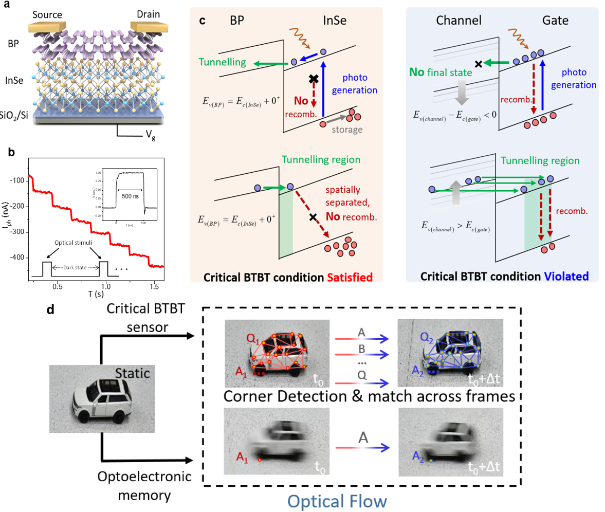 同時,該研究還聚焦于實現類視網膜高速紅外光電存儲與動目標追蹤的協同集成。研究通過構建BP/InSe二維范德華異質結結構,發現了非平凡帶帶隧穿效應,實現了在520至980nm寬譜范圍內可見-近紅外的低能紅外光子隧穿與非易失性存儲。這一機制優于傳統photogating效應或浮柵器件,在不犧牲響應速度的前提下,抑制了拖尾與模糊現象,實現了500ns級別的光存儲速度。