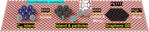 近日,中國科學院蘭州化學物理研究所科研團隊聯(lián)合瑞士巴塞爾大學、奧地利薩爾茨堡大學的科研人員,在制備石墨烯量子點研究方面取得進展。該團隊結合原位熱退火與非接觸原子力顯微技術,在金屬Pt(111)表面捕獲到穩(wěn)定的C60二聚體,并揭示了這種二聚體向石墨烯量子點乃至更大尺寸石墨烯片的完整演化路徑。