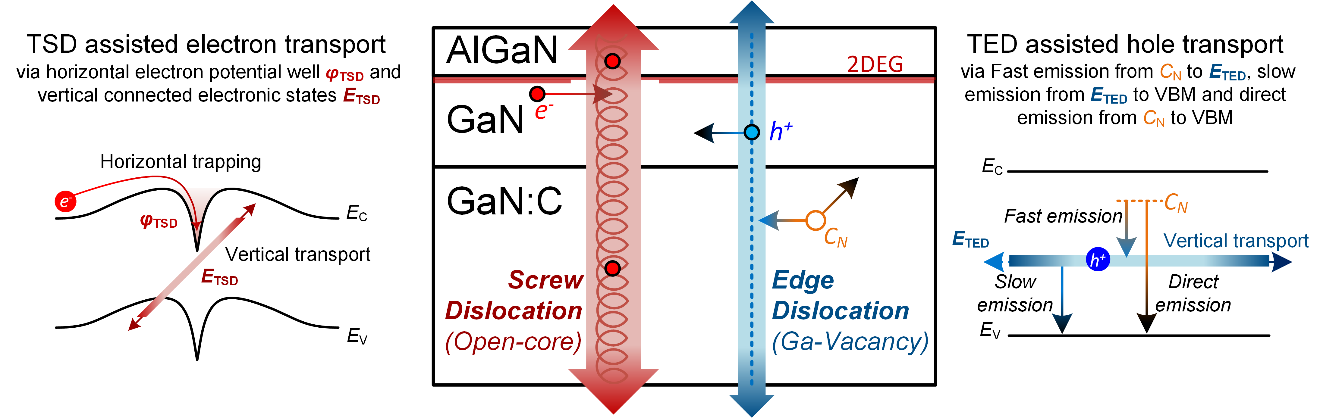 針對(duì)上述問(wèn)題,中國(guó)科學(xué)院微電子研究所GaN基功率電子器件研發(fā)團(tuán)隊(duì)聯(lián)合北京大學(xué)、香港科技大學(xué)、劍橋大學(xué)、武漢大學(xué)、中國(guó)科學(xué)院半導(dǎo)體所和蘇州能訊高能半導(dǎo)體有限公司等單位,首次澄清了GaN異質(zhì)外延中螺位錯(cuò)(open-core)和刃位錯(cuò)對(duì)GaN基功率電子器件的關(guān)鍵可靠性-動(dòng)態(tài)導(dǎo)通電阻退化的影響機(jī)理,構(gòu)建了“雙通道位錯(cuò)輸運(yùn)”模型,明確了GaN外延層中螺位錯(cuò)和刃位錯(cuò)可分別充當(dāng)電子與空穴的獨(dú)立傳輸路徑,對(duì)器件漏電和動(dòng)態(tài)電阻的退化產(chǎn)生相反的影響。
