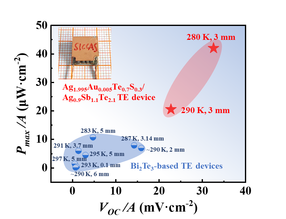 該工作開發(fā)的Ag基熱電器件與代表性Bi2Te3基熱電器件的電壓密度和功率密度對(duì)比圖