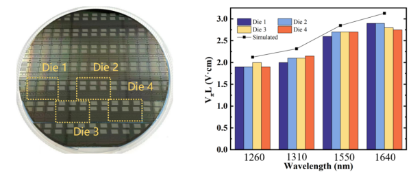 四個(gè)芯片上器件在不同波長下的調(diào)制效率測試結(jié)果(折線為模擬計(jì)算值)