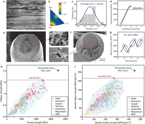 基于上述原則,研究選擇傳統金屬材料中具有最高彈性模量的鋼,并具體到組織極細且穩定的珠光體鋼,來探討疲勞強度理論上限。研究通過冷拔工藝,消除弱取向片層,形成<110>織構,提升組織強度均勻性。研究通過固溶強化、加工硬化和晶界強化協同作用,實現2850 MPa超高彈性極限和3525 MPa超高抗拉強度。上述高強均勻組織,可抑制滑移帶應變局部化導致的疲勞開裂,獲得超高理論疲勞強度。研究通過超純凈冶煉和后續多道次拉拔,實現珠光體鋼絲夾雜物平均尺寸僅1.38 μm,降低應力集中。在現有冶煉水平下,夾雜物不可避免,因此通過優化拉拔工藝,使鋼絲在具有超高強度的同時仍保留一定應變硬化能力,從而降低夾雜物周圍組織應力集中程度。在強<110>織構的納米片層組織冷拔珠光體鋼絲中,研究提高了拉-拉疲勞強度及拉-拉比疲勞強度世界紀錄。