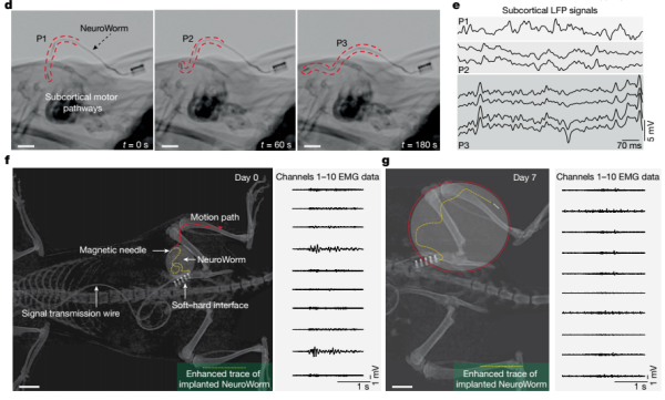 研究團隊將這種動態電極命名為NeuroWorm。在磁場控制下,NeuroWorm實現了在實驗對象兔子顱內“游走”,并根據需要主動更換監測目標。