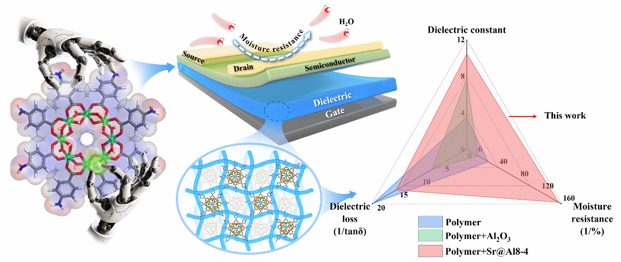 場(chǎng)效應(yīng)晶體管是微電子技術(shù)的核心。構(gòu)建具有高介電常數(shù)、低介電損耗和良好環(huán)境穩(wěn)定性的聚合物復(fù)合介電材料,對(duì)于提升場(chǎng)效應(yīng)晶體管的性能和可靠性至關(guān)重要。但是,傳統(tǒng)的高介電常數(shù)摻雜材料,存在界面粗糙、易團(tuán)聚、兼容性不足、損耗高和濕度敏感等問(wèn)題。同時(shí),由此產(chǎn)生的器件吸濕效應(yīng)會(huì)導(dǎo)致介電性能不穩(wěn)定,阻礙聚合物復(fù)合界面上載流子運(yùn)輸機(jī)制的理論研究。