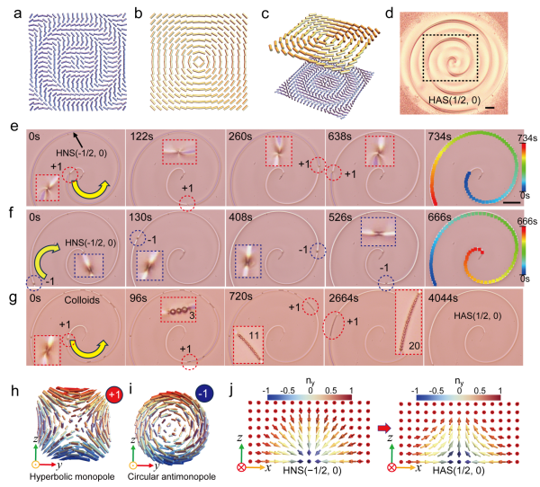 研究團隊通過在向列相液晶盒中設計具有幾何阻挫的界面圖案,在半斯格明子弦中誘導產生了8種不同類型的單極子結構,包括雙曲型、圓形及中間態的(反)刺猬構型。這些單極子作為拓撲場的源與匯,成為連接不同半斯格明子構型的重要橋梁。通過線性偏振藍光驅動系統脫離平衡態,團隊實現了單極子對之間從吸引到排斥的動態切換,進而誘導半斯格明子發生拓撲轉變,如從半奈爾斯格明子轉變為半反斯格明子。