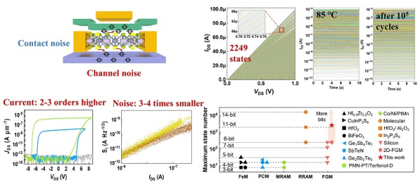 近期,中國(guó)科學(xué)院國(guó)家納米科學(xué)中心在二維浮柵晶體管中,實(shí)現(xiàn)了11比特狀態(tài)的穩(wěn)定存儲(chǔ)。該突破主要得益于以下三方面的協(xié)同創(chuàng)新:一是采用Bi/Au金屬電極,有效降低MoS2晶體管的肖特基勢(shì)壘高度,使其開(kāi)態(tài)電流提高至100μA,電流存儲(chǔ)窗口擴(kuò)大至108,同時(shí)電流噪聲降至儀器檢測(cè)極限;二是開(kāi)發(fā)雙脈沖編輯方法,抑制缺陷態(tài)捕獲電荷對(duì)存儲(chǔ)狀態(tài)穩(wěn)定性的干擾;三是利用柵注入模式,使重復(fù)擦寫(xiě)操作所產(chǎn)生的介電層缺陷態(tài)遠(yuǎn)離溝道區(qū)域,顯著提升循環(huán)穩(wěn)定性。