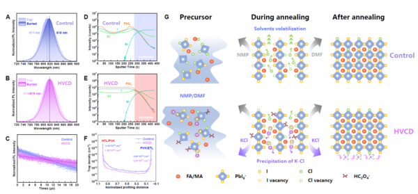 針對傳統(tǒng)生長方法導致鈣鈦礦中氯元素分布不均的問題,團隊提出了垂直方向均勻化氯元素分布的策略(HVCD):通過在鈣鈦礦薄膜生長中引入堿金屬草酸鹽,利用解離出的鉀離子與氯離子之間的強結(jié)合作用,有效束縛氯元素的垂直無序遷移,使其在鈣鈦礦材料中均勻分布。基于這一方法,研究團隊成功制備出載流子壽命高達20微秒,界面缺陷態(tài)密度低至1013每立方厘米的鈣鈦礦半導體薄膜,顯著抑制了由鹵素Cl元素上表面富集引起的載流子復(fù)合,并消除了界面電子勢壘。