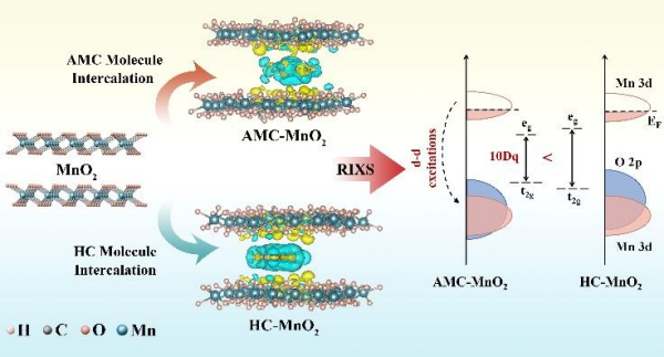 科研團隊選取含吸電子基團的7-乙酰氧基-4-甲基香豆素(AMC)有機分子、含供電子基團的7-羥基香豆素(HC)有機分子作為插層劑,通過液相插層法制備得到兩種插層型二氧化錳,利用密度泛函理論計算確認含吸電子基團的AMC有機分子與氧的相互作用更強,并促進Mn 3d與O 2p軌道之間雜化程度的增強。