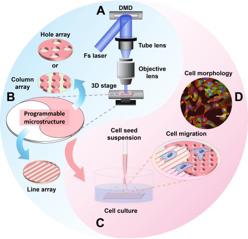 生物材料表面的微觀形態(tài)特征對細(xì)胞增殖、黏附和分化有重要影響。然而,表面特性調(diào)控細(xì)胞行為的具體機(jī)制仍不明確。目前,用于細(xì)胞調(diào)控的表面設(shè)計過于單一,難以同時滿足高精度制造與結(jié)構(gòu)多功能性的雙重要求。飛秒激光無掩模光學(xué)投影光刻技術(shù),采用數(shù)字微鏡器件作為掩模板,能夠快速制備高精度大面積的可編程細(xì)胞芯片,并有效調(diào)控細(xì)胞浸潤性。