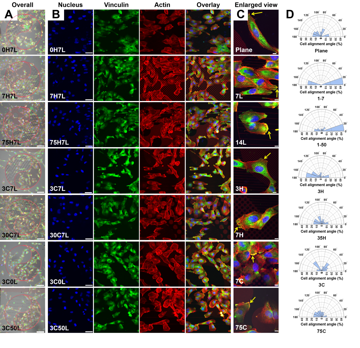 團(tuán)隊(duì)采用飛秒激光無掩模光學(xué)投影光刻技術(shù),制備了具有不同形貌的可編程細(xì)胞培養(yǎng)芯片,實(shí)現(xiàn)對細(xì)胞形態(tài)和細(xì)胞行為的調(diào)控。該細(xì)胞培養(yǎng)芯片結(jié)構(gòu)可調(diào)控細(xì)胞在不同線間距、柱直徑及孔徑的支架結(jié)構(gòu)上的遷移、黏附及形態(tài)變化。