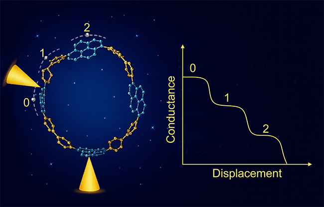 團隊還在碳納米環(huán)主鏈中嵌入芘單元,構建了低對稱性環(huán)形結構。該設計打破了原有π體系的電子等效性,使分子軌道在空間上發(fā)生局域化,實現了室溫下穩(wěn)定的三態(tài)電導特性。理論計算進一步表明,對稱性降低導致電子傳輸通道離散化,實現了室溫下的三值邏輯功能。
