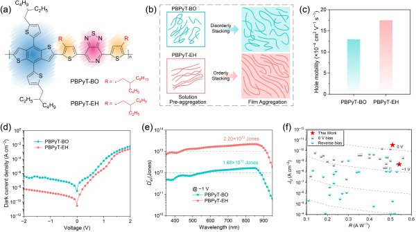 此外,研究團隊通過烷基側鏈對分子間相互作用和分子堆積的調控機制,進一步開發(fā)了具有出色性能和普適性的PBPyT-EH給體,其分子間相互作用顯著提升,誘導光敏層中形成更加有序的π-π堆積形貌,促進電荷傳輸的同時高效抑制光敏層的缺陷態(tài)密度。基于PBPyT-EH的近紅外OPDs器件獲得了Jd=1.88nA/cm2的暗電流噪聲、R=0.542A/W的光響應度,以及D*=2.2×1013Jones的探測性能。