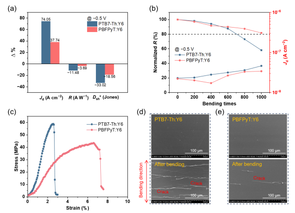 柔性傳感器在穿戴智能電子、具身智能、生物醫(yī)學成像等眾多領域具有廣闊的應用前景。基于共軛高分子光敏材料的有機光電探測器(OPDs)具有本征柔性、成本低、功耗低等優(yōu)點,近年來受到廣泛關注。目前,柔性OPDs器件仍面臨探測性能較低、機械穩(wěn)定性偏差等問題,限制了其實際應用。