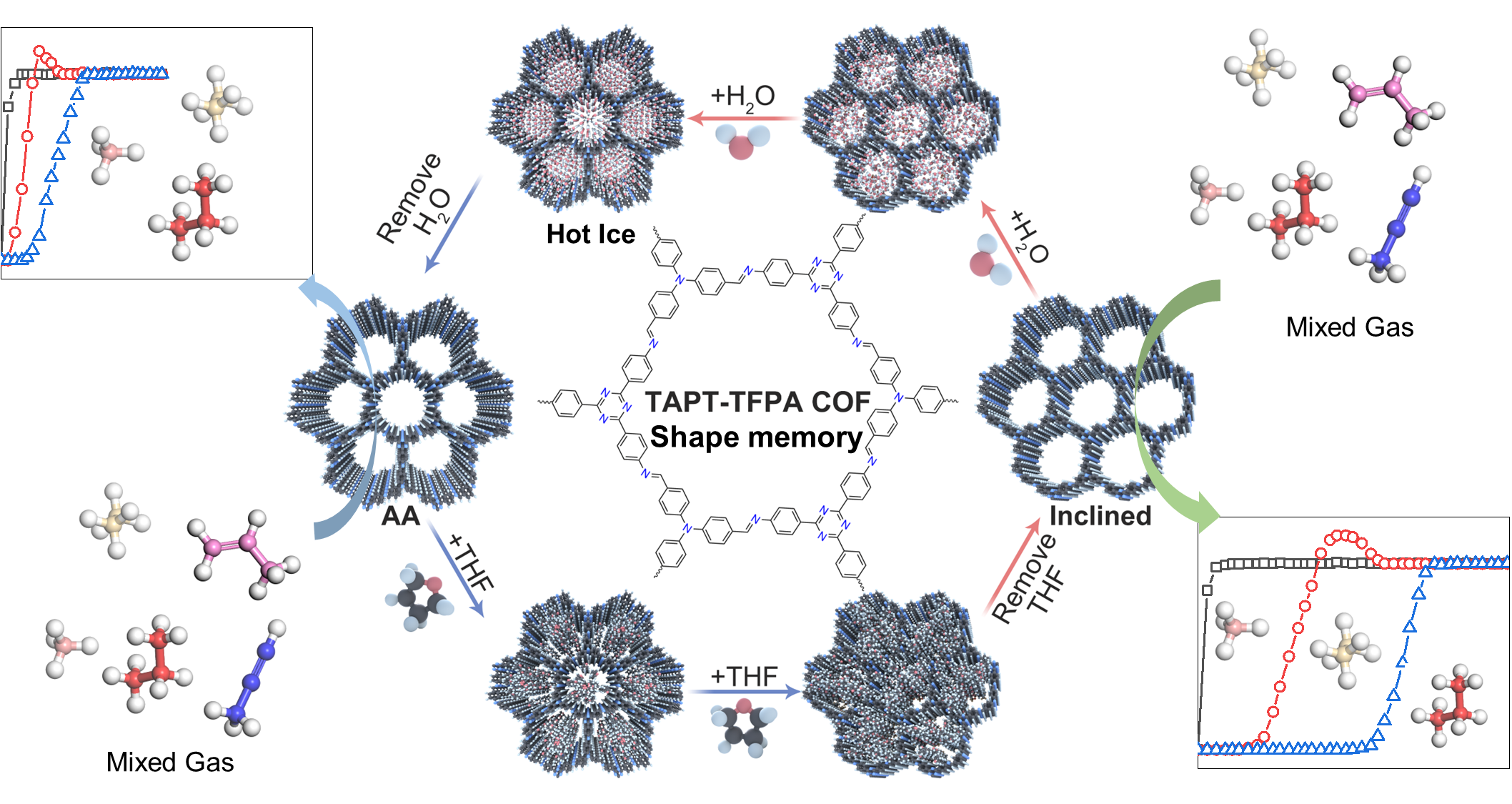 借助該可逆滑移結(jié)構(gòu)及可調(diào)孔道,研究進(jìn)一步展示了甲烷—乙烷—丙烷,以及丙烯—丙炔動(dòng)態(tài)智能氣體分離的應(yīng)用潛力。該策略為2D COF層間滑移調(diào)控、納米限域相變及高效氣體分離提供了新思路。