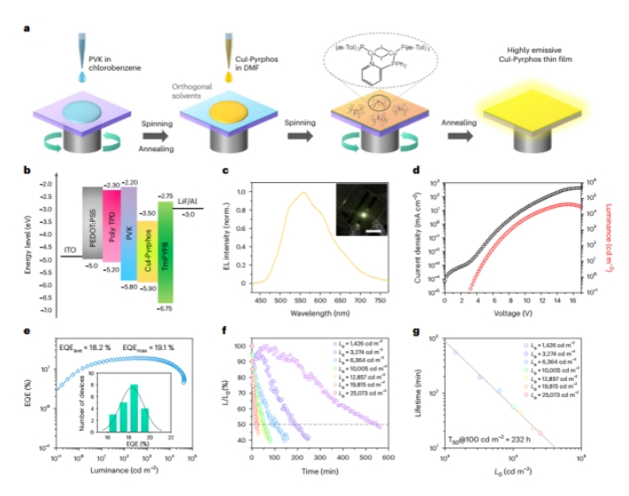 近日,中國科學(xué)技術(shù)大學(xué)姚宏斌課題組基于新型銅碘雜化團簇,構(gòu)筑出低成本、高效率、高亮度暖白光發(fā)光二極管(LED)器件。得益于所設(shè)計的銅碘雜化團簇具備的高構(gòu)型熵、高發(fā)光效率和寬光譜發(fā)射等特性,研究實現(xiàn)了高效暖白光LED器件無摻雜、低成本、大面積的溶液法涂布制備,這是非鉛金屬鹵化物L(fēng)ED領(lǐng)域的新突破。相關(guān)研究成...