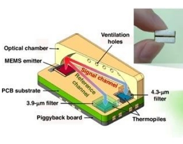 近日,中國(guó)科學(xué)院上海微系統(tǒng)與信息技術(shù)研究所研究員李鐵團(tuán)隊(duì)在超小型二氧化碳(CO?)氣體傳感器研制方面取得進(jìn)展。該團(tuán)隊(duì)制備的傳感器具有尺寸小、功耗適中、性能穩(wěn)定、成本低以及在中紅外波段發(fā)光效率高等特點(diǎn),具備良好的抗?jié)裥浴⒎€(wěn)定性和可重復(fù)性,在可穿戴呼吸監(jiān)測(cè)應(yīng)用中具有應(yīng)用前景。相關(guān)研究成果以Ultra-compact...