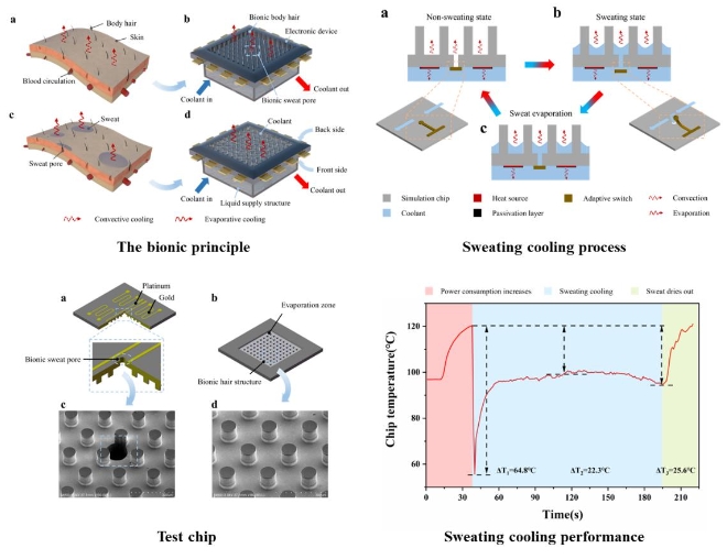 近日,微電子所新技術(shù)開發(fā)部微系統(tǒng)技術(shù)實驗室焦斌斌研究員團隊在芯片自適應(yīng)微流散熱領(lǐng)域取得了新進展。本研究從動物通過毛孔蒸發(fā)汗液以增強散熱獲得靈感,基于仿生原理,在硅基微流冷板內(nèi)制備了溫敏閥體結(jié)構(gòu)及工質(zhì)蒸發(fā)區(qū)。當(dāng)芯片在極端高功耗工況下工作使自己溫度急劇升高時,溫敏閥體打開并釋放冷卻工質(zhì)至蒸發(fā)區(qū)以實現(xiàn)...