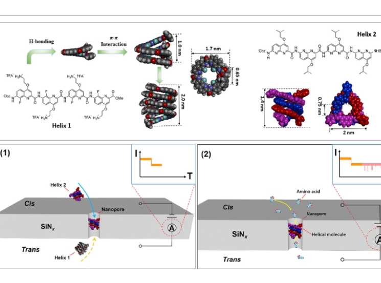 近年來,納米通道單分子分析發(fā)展迅速。該研究結(jié)合無機氮化硅材料的物化穩(wěn)定性以及有機螺旋手性分子的可設(shè)計和內(nèi)腔可調(diào)等性質(zhì),構(gòu)筑出新型無脂質(zhì)支撐的小尺寸類蛋白復(fù)合手性納米通道,形成外表堅固以及內(nèi)表尺寸和表面性質(zhì)高度可重現(xiàn)的穩(wěn)定分析平臺。該工作構(gòu)建的復(fù)合通道在不同離子溶液中表現(xiàn)出良好的離子傳輸性能,可以...