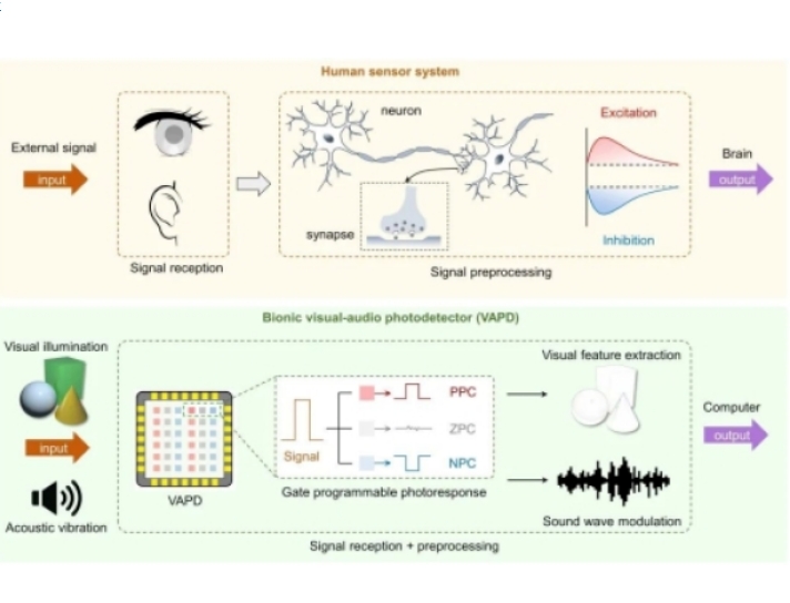 近日,中國(guó)科學(xué)院重慶綠色智能技術(shù)研究院微納制造與系統(tǒng)集成研究中心,在《科學(xué)進(jìn)展》(Science Advances)上發(fā)表了題為《可片上探測(cè)和預(yù)處理的仿生視聽(tīng)光電探測(cè)器》(Bionic visual-audio photodetectors with in-sensor perception and preprocessing)的研究論文。該研究提出了仿生“視聽(tīng)”光電探測(cè)器,通過(guò)模擬人類...