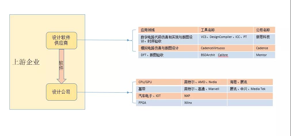 產(chǎn)業(yè)鏈上游是電子自動(dòng)化設(shè)計(jì)(EDA)軟件供應(yīng)商和集成電路設(shè)計(jì)公司。EDA公司主要有三家Synopsys、Cadence和Mentor,三家公司的擅長(zhǎng)領(lǐng)域不同,但是業(yè)務(wù)也有交叉,國(guó)內(nèi)廠商有華大九天。設(shè)計(jì)公司有英特爾、高通、聯(lián)發(fā)科、博通等,國(guó)內(nèi)設(shè)計(jì)公司有華為海思、紫光展銳和匯頂科技等。